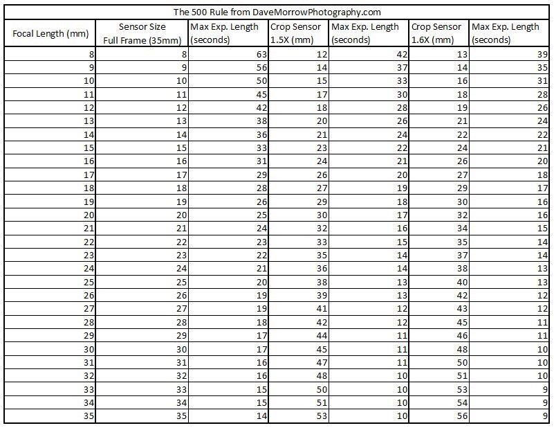 ٥٠٠ تقسيم (الطول البؤري) = (مدة التعريض بالثانية)