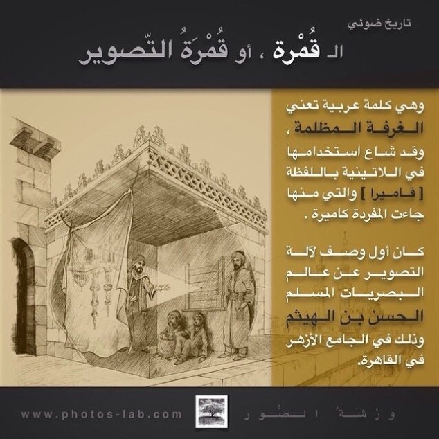 حيث كان الحسن ابن الهيثم هو أول من قدم وصفا واضحا وصحيحا الغرفة المظلمة أو ما تعرف أيضا بالكاميرا ذات الثقب. حيث وصف أثر مرور الضوء عبر ثقب صغير بأنه يظهر صورة كل شيء على سطح الجانب المقابل لتلك البؤرة. فكان بذلك أول من نجح في مشروع نقل صورة من الخارج إلى شاشة داخلية كما في الكاميرة المظلمة والتي اشتق الغرب اسمها من الكلمة العربية: “قُمرة”، وذلك عن طريق المفردة camear obscura اللاتينية والتي تعني الغرفة المظلمة.