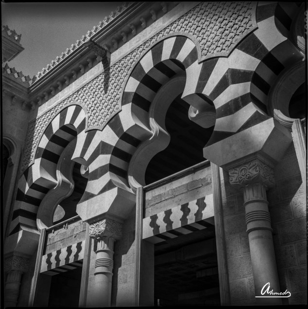 وهما لجامع الشيخ محمد العيسى بمدنية الرياض ، الجامع مبني على الطراز الأندلسي. تم التقاطها بواسطة كاميرا Yashica D 80mm , مقاس الصور Medium format 120mm , نوع الفلم iLford HP5 plus ISO 400. مادة التحميض: تم استخدام ilfosol 3، وميزه هذا الحمض إعطاء حدة للصور مع كنتراس عالي .