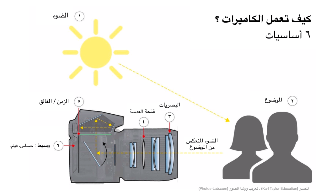 | ٦– | وسيط | : | هذا ما نسجل الصورة الملتقطة عليه (كان الوسيط في الماضي فيلمًا، ولكن في الوقت الحاضر عادة ما تكون شريحة CMOS أو CCD). |